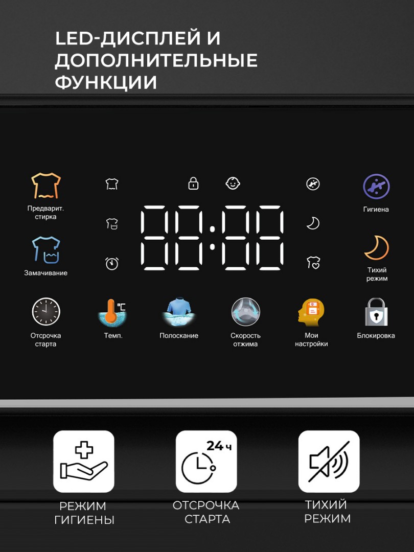 - 16 автоматических программ справятся с любыми загрязнениями на любом типе ткани и виде одежды. Дополнительные функции позволят вам самостоятельно выбрать оптимальные параметры стирки (дополнительное полоскание, регулировка температуры и оборотов отжима, предварительная стирка или замачивание, отсрочка старта).