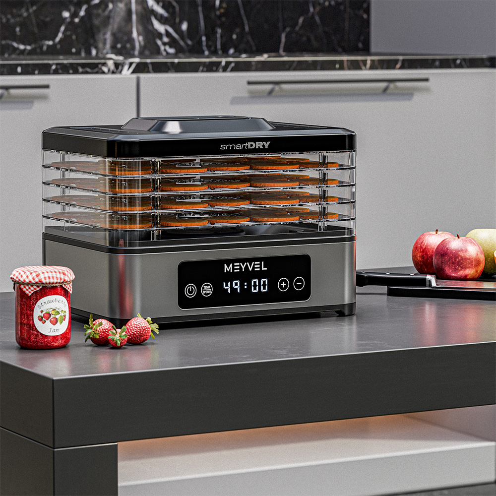 Благодаря продуманной системе циркуляции воздуха дегидратор Meyvel MDH5-1P (Black) работает тихо — менее 60 дБ, что сравнимо с фоновым шумом кухни. Вы можете использовать его даже ночью, не мешая домашним. Воздух распределяется по всей камере равномерно, исключая пересушивание или неверное приготовление.