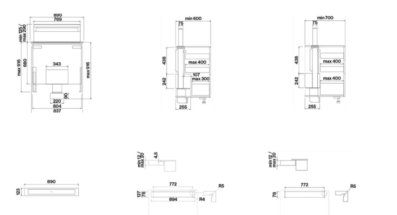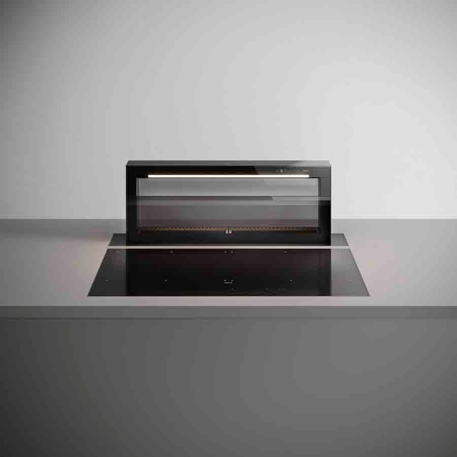 Особенности модели под указанной высотой вытяжки подразумевается максимальная высота выдвигаемой части над столешницей, максимальная высота встраиваемой части - 91,6 см, вытяжкой также можно управлять непосредственно с индукционной варочной панели Falmec с помощью технологии Dialog System, которая имеет автоматическую функцию для удобства взаимодействия, периметральное втягивание