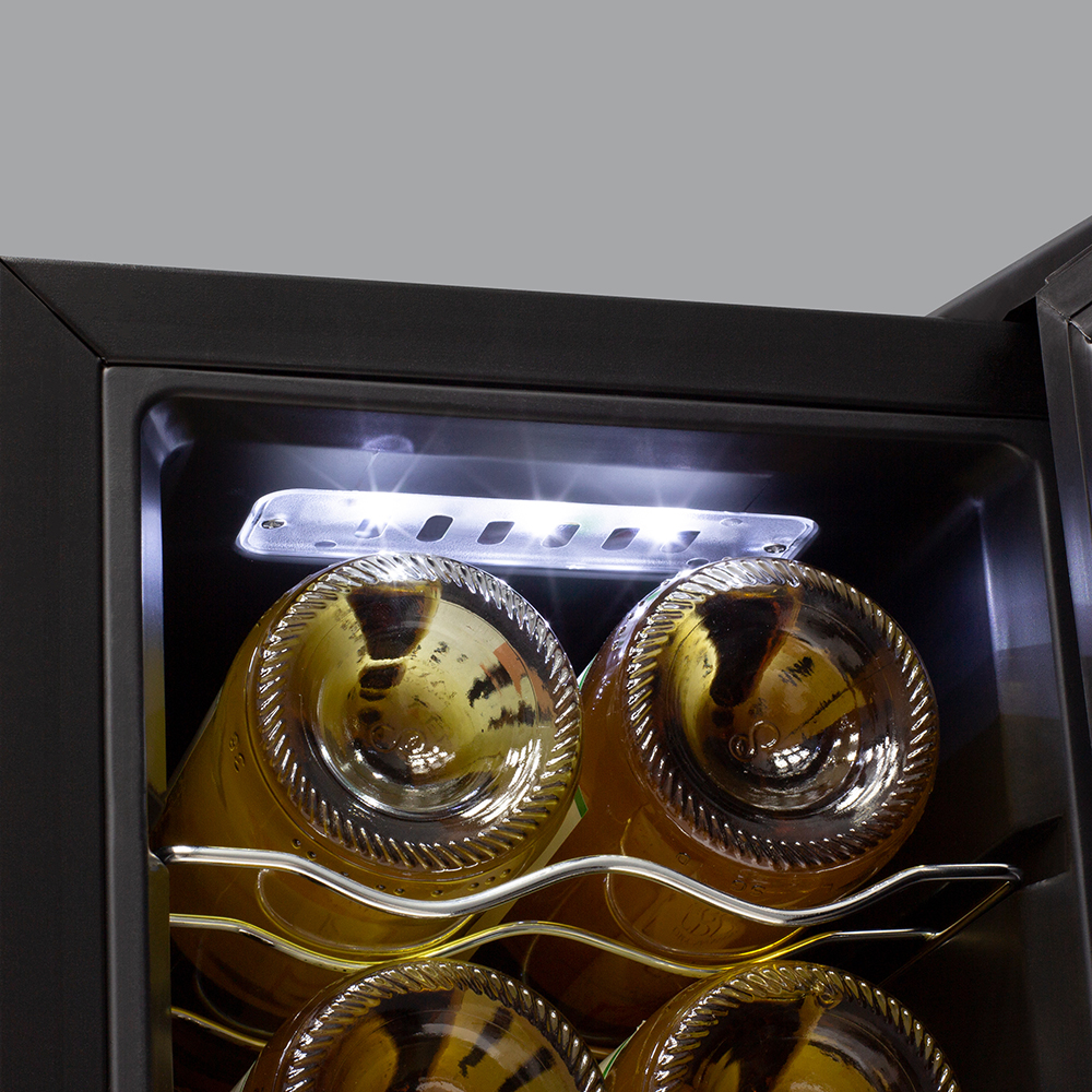 Термоэлектрический винный шкаф Meyvel MV12-TBD1 обладает небольшой вместимостью и способен разместить в себе до 12 бутылок. Управление осуществляется с помощью интуитивно-понятной сенсорной панели. Внутреннее пространство шкафа имеет одну температурную зону с возможностью настраивать её в диапазоне от +10 °C до +18°C. Электронный термостат помогает стабильно поддерживать заданную Вами температуру. Внутренняя влажность держится в диапазоне 60-80%. Перечисленные особенности создают условия хранения, которые надолго сохранять вкусовые качества вашей винной коллекции. Дополнительно у данной модели шкафа предусмотрен демонстрационный режим, во время которого освещение не гаснет.